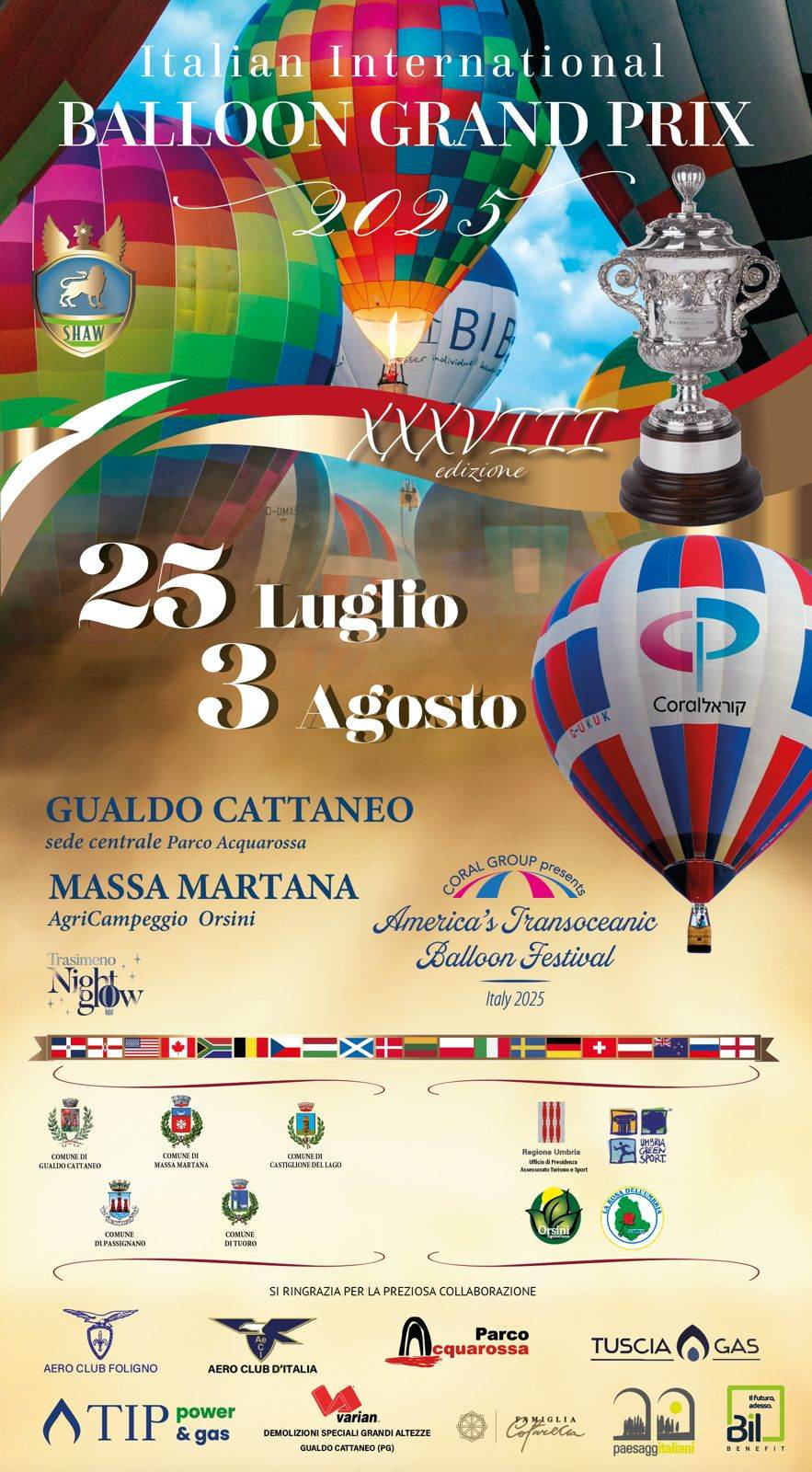 Dal 25 luglio al 3 agosto 2025 Massa Martana e Gualdo Cattaneo ospiteranno la trentottesima edizione dell'Italian International Balloon Grand Prix. Piloti da tutto il mondo si riuniranno per questa manifestazione che trasforma il cielo umbro in uno spettacolo di colori.