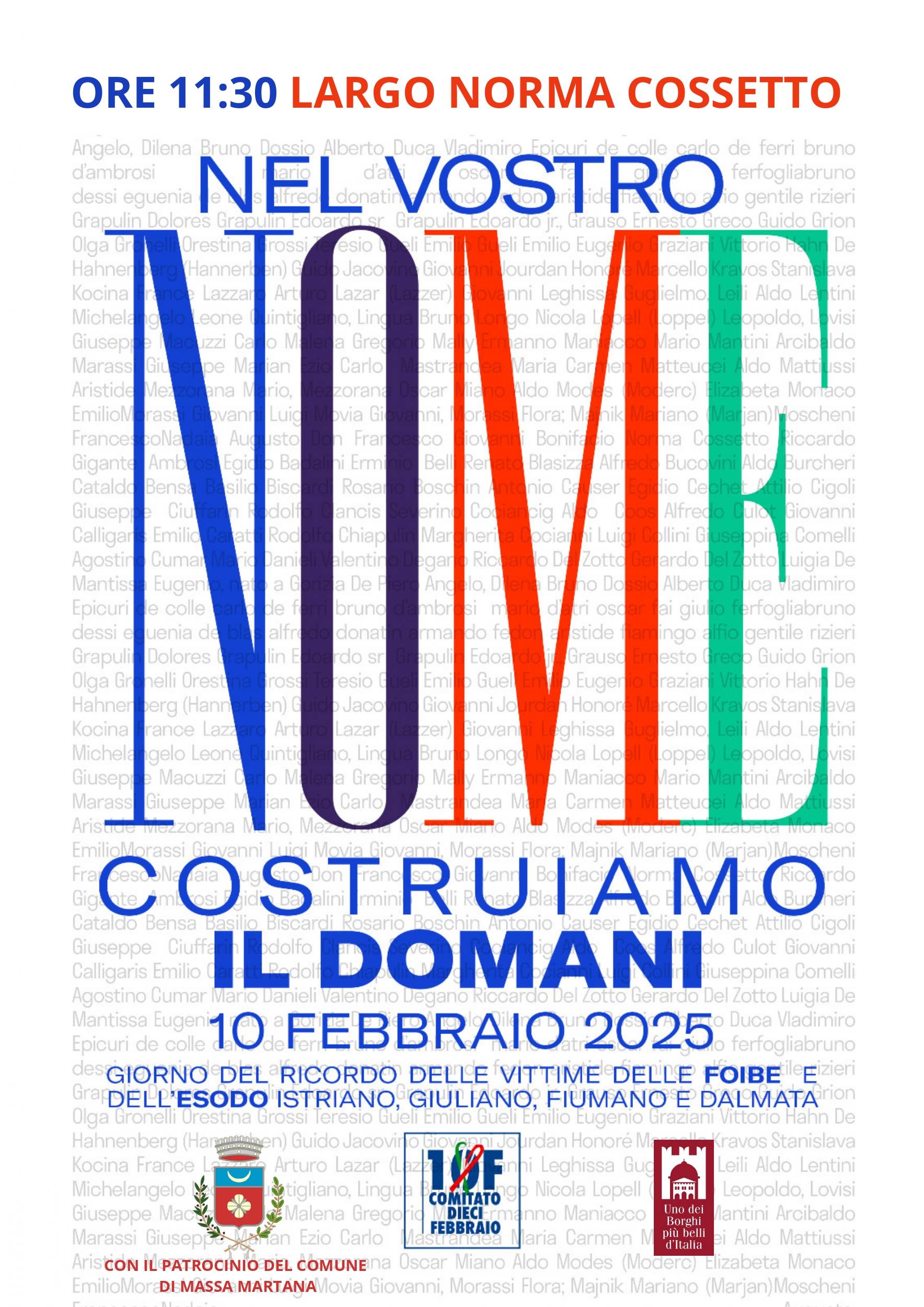 Il Comitato 10 Febbraio di Massa Martana organizza, in occasione del Giorno del Ricordo, una cerimonia per conservare e rinnovare la memoria della tragedia degli italiani e di tutte le vittime delle foibe, dell'esodo dalle loro terre degli istriani, fiumani e dalmati nel secondo dopoguerra e della più complessa vicenda del confine orientale.
