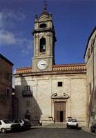 La facciata è costruita da blocchi di pietra squadrata ed è ripartita in quattro grandi riquadri conclusi, in alto, da un cornicione e da una finta balaustra. Dalla balaustra si eleva il barocco campanile eretto nel 1637 con il concorso del cardinale Barberini.