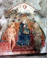 Nella parete a sinistra dell’entrata due grandi nicchie conservano due buoni affreschi del XVI secolo: nel primo una Crocifissione, nell’altro la Madonna in trono con il Bambino tra San Rocco e Sant'Ambrogio.