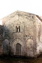 La facciata ha un caratteristico portale a tutto sesto con quattro archi rientranti, affiancato da due arcate cieche, anch'esse a tutto sesto. Sopra la porta centrale si apre una bifora con colonnina di marmo. In alto è incastonata una lastra alto medioevale, databile al IX secolo. Una bella Croce ad intreccio divide la lastra in quattro scomparti, in ciascuno dei quali è una figura. In alto due uccelli, poggianti sui bracci della Croce; in basso, a sinistra, un uomo tira l'arco in direzione dello scomparto di destra, dove è raffigurato un cervo che bruca le foglie di un ramo germogliante dalla base della Croce.
