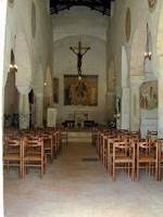 Nell'interno, diviso in tre navate, si conservano urne cinerarie, frammenti decorativi romani e numerose iscrizioni. Notevoli il grande capitello corinzio riutilizzato come sostegno dell'ultima arcata di destra; i frammenti dell'antico pavimento a mosaico e ad opus spicatum, ritrovati in recenti lavori di restauro; il grande cippo con l'iscrizione che ricorda i Vicani Vici Martis riutilizzato come base per l'altare maggiore.